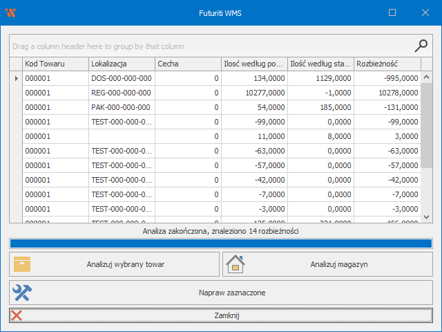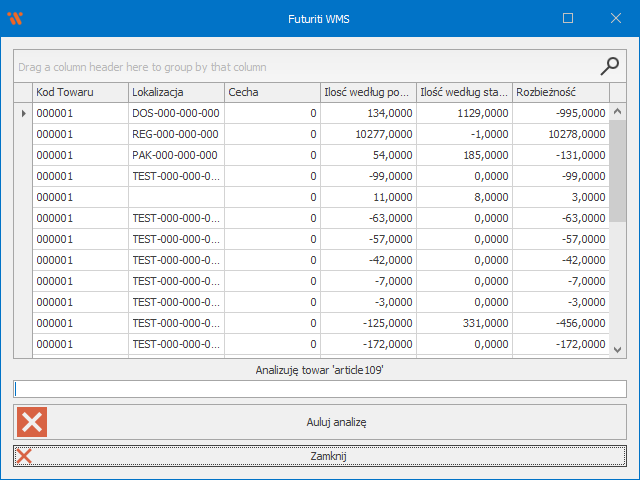 Lista różnic będzie uzupełniania na bieżąco, a aktualnie analizowany towar będzie wyświetlony wraz z paskiem progresu. Analizę można anulować w każdym momencie, jednak po anulowaniu nie będzie możliwa automatyczna naprawa stanów.
