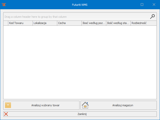 - Analiza magazynu – pozwala na analizę całego magazynu (wszystkie dokumenty dla wszystkich towarów). W zależności od rozmiaru bazy danych operacja ta może trwać bardzo długo
