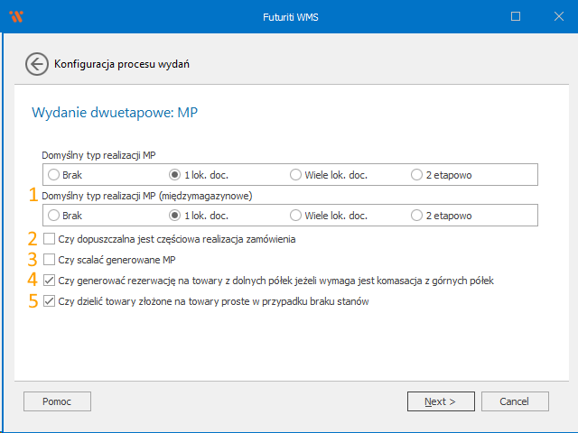 - Wydanie dwuetapowo (MP → WM) – proces dwuetapowy, w którym po zsynchronizowaniu zamówienia, WMS wygeneruje dokumenty MP z lokalizacji na pakowanie, po realizacji tych dokumentów, odblokowany zostanie dokument WM. Proces ten nie wymaga akcji w ERP