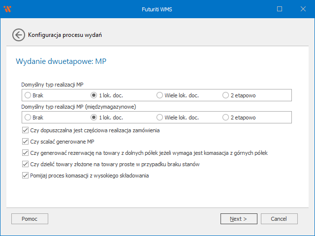 - Wydanie dwuetapowo (MP → WM) – proces dwuetapowy, w którym po zsynchronizowaniu zamówienia, WMS wygeneruje dokumenty MP z lokalizacji na pakowanie, po realizacji tych dokumentów, odblokowany zostanie dokument WM. Proces ten nie wymaga akcji w ERP