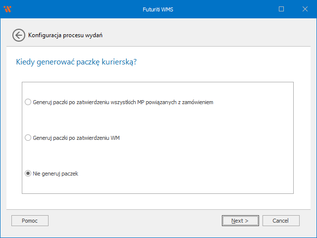 - W przypadku procesu jednoetapowego, nie powstają żadne dokumenty MP w rezultacie opcja ta wyłączy automatyczne generowanie paczek