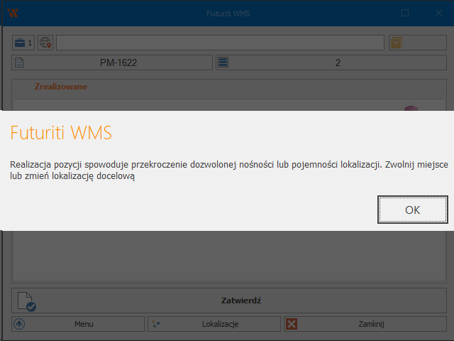 Jeśli przyjęcie towaru przekroczy parametry lokalizacji, system wyświetli stosowny komunikat.