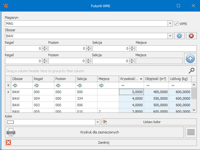W oknie struktury magazynu użytkownik może ręcznie edytować parametry lokalizacji. Istnieje możliwość seryjnego uzupełnienia kolumny poprzez zaznaczenie kilku wierszy.