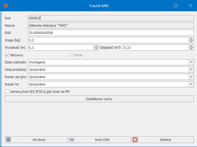 - Data ważności/produkcji, numer seryjny/lot – określa czy domyślne cechy partii są wymagane/opcjonalne lub nieobsługiwane