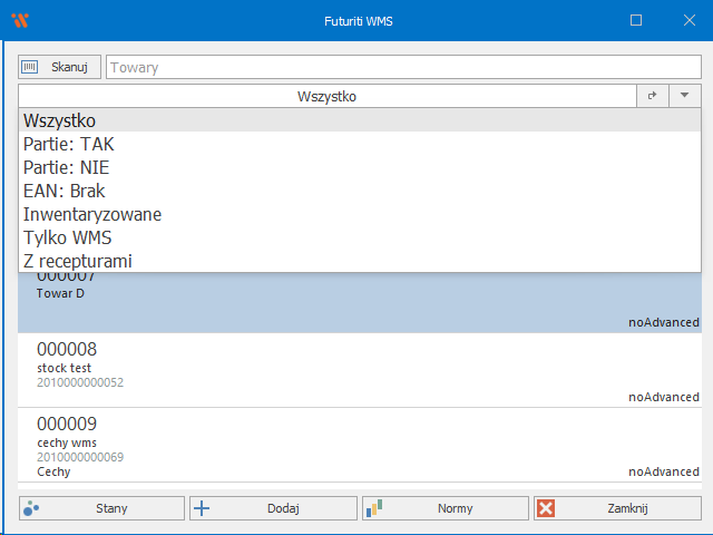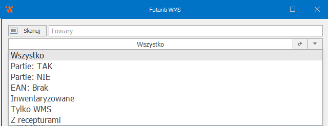 - Wszystko – wyświetla wszystkie towary