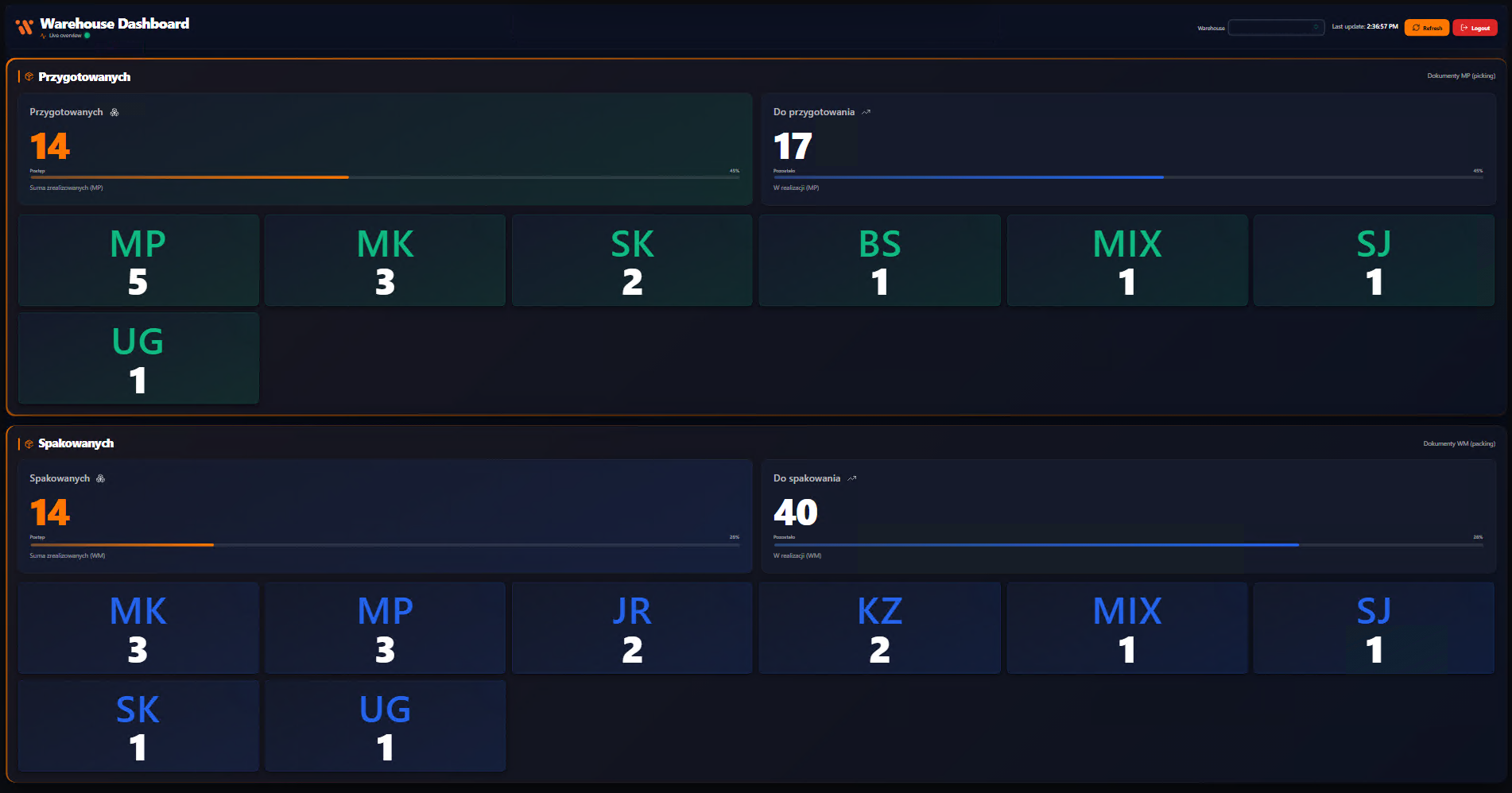 WMS Dashboard jest osobną aplikacją pozwalającą na monitorowanie pracy w magazynie w sposób graficzny w przeglądarce